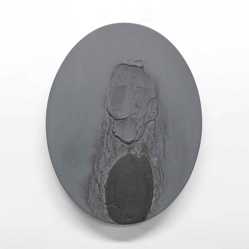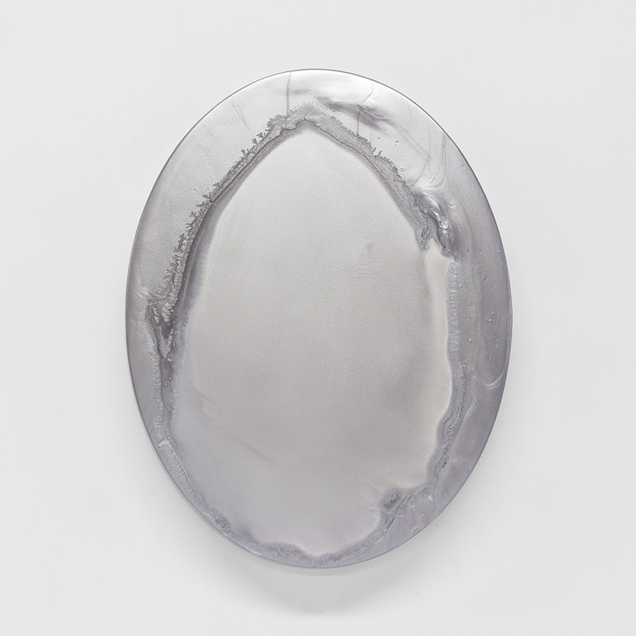 Scaled and oriented in relation to the human head, these silver and gray-scale oval panel paintings allude, however obliquely, to the human intimacy of mirrors and art historical portrait formats such as the cameo.